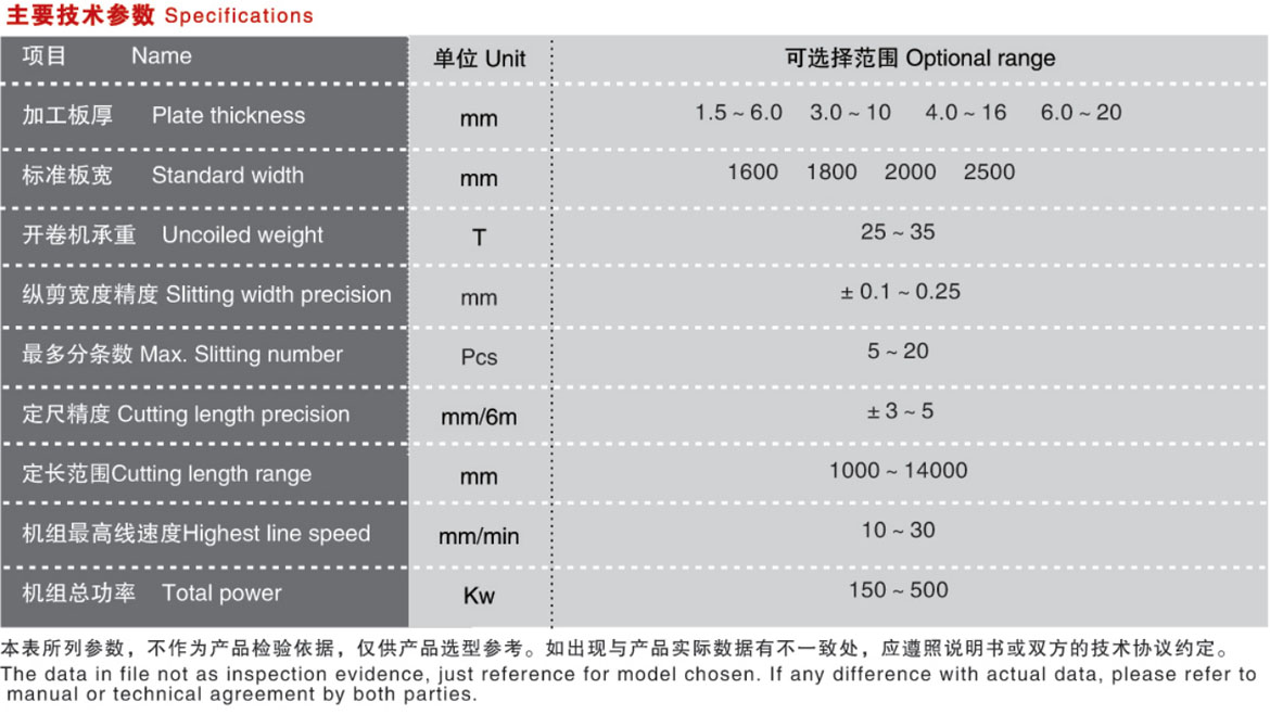 由上料小车、开卷机、引头装置、牵引夹送及粗校、过渡台、对中装置、纵剪主机、校平主机、剪板机、落料出料装置等组成,可另外选配废边卷取装置。