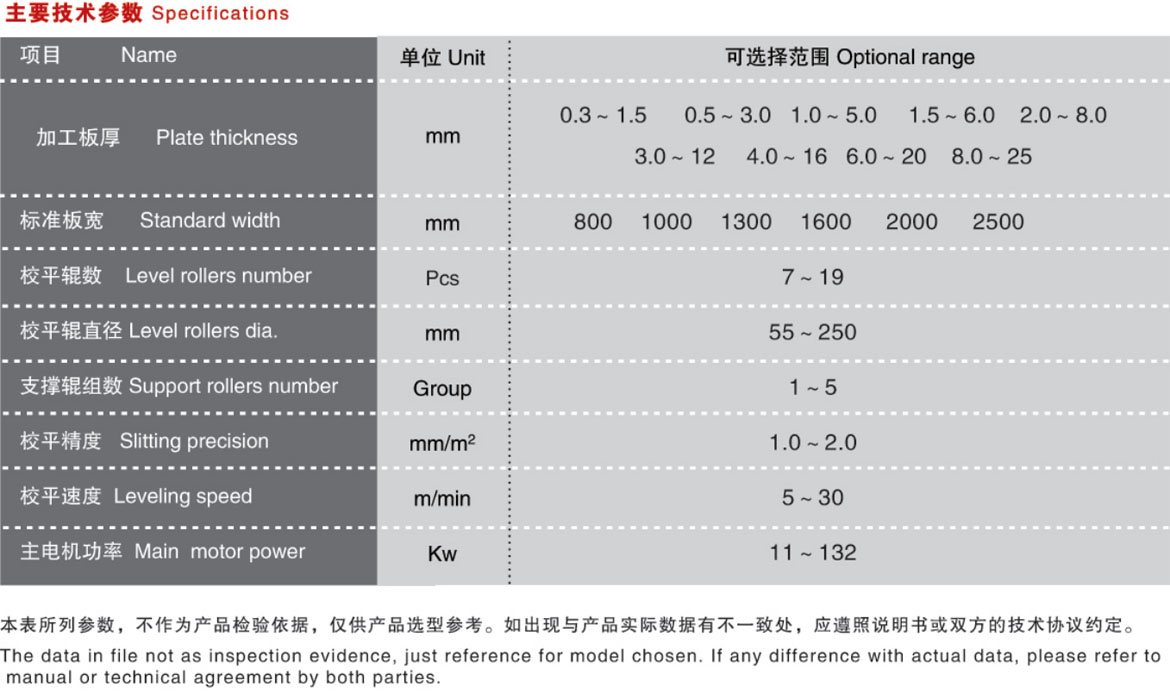 性能特点: 本机床为辊式金属板料整平专用设备,通常由动力、主机和电器控制等部分组成。利用多辊工作原理,使板料在上、下校平辊之间反复变形,消除应力,达到校平的目的。在上、下排工作辊外侧,设刚性支撑辊(轮),构成四重式组辊结构。板料通过本机校平,可明显改善其平整状态,提高工件的质量。可独立工作,用于单块板材的校平;亦可在本机前配置开卷、引料,后面配置剪切、垛料及联机机构等,通过控制系统连成性能完备的生产线,对金属卷材进行整平、分切。